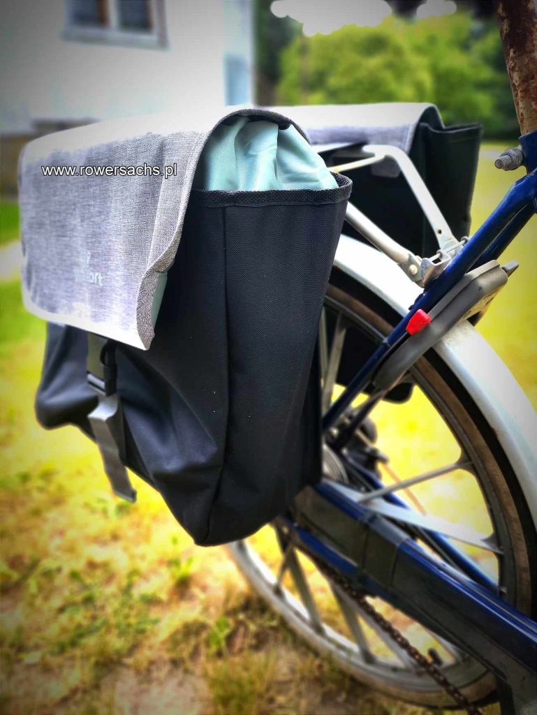 Pojemna 2-komorowa torba rowerowa na bagażnik tylny. Bardzo szybki montaż zapewnia zastosowanie wytrzymałego rzepu. Komory są ze sznurkiem ściągającym i zapięciem plastikowym, dzięki czemu żaden przedmiot nie wypadnie z nich podczas jazdy. Torba została wykonana z wytrzymałego poliestru odpornego na zachlapanie i trudne warunki atmosferyczne. Bezpieczeństwo rowerzysty zwiększa dodatkowy odblaskowy pasek.